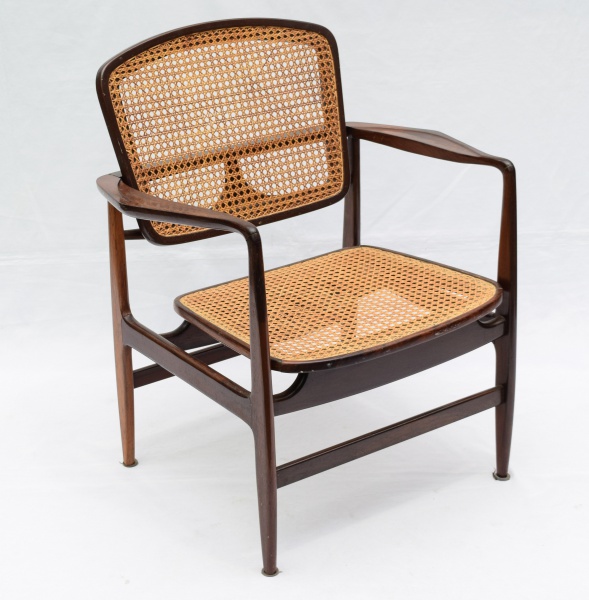 • SÉRGIO RODRIGUES - Poltrona leve "Oscar" - Estrutura de Jacarandá maciço, encosto e assento de palhinha. A poltrona foi desenhada a pedidos do Jockey Club do Rio de Janeiro, que rejeitou o protótipo por questão de gosto. Sergio Rodrigues expôs o modelo em sua loja e o primeiro comprador foi o arquiteto Oscar Niemeyer. O nome da poltrona faz menção a esse causo. Medidas: 65 cm x 65 cm x 80 cm (altura)