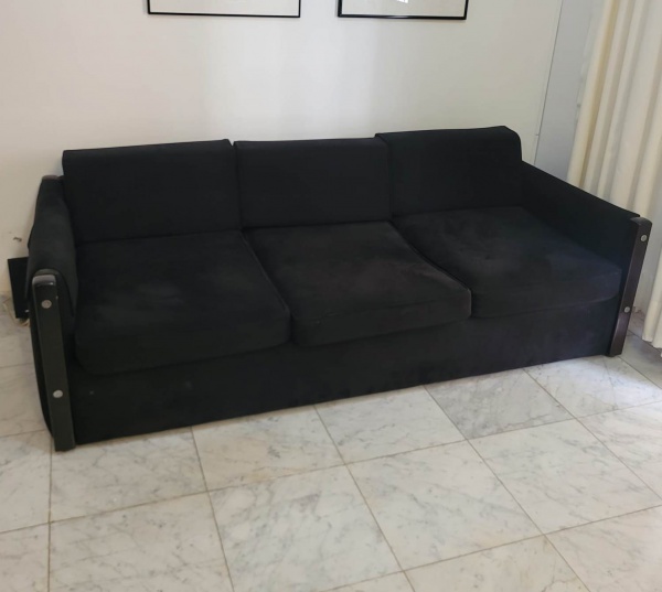 • SÉRGIO RODRIGUES - Sofá de três lugares modelo "Millôr" executado em jacarandá maciço com corpo estofado em tecido, inclusive nas laterais. Assentos e encostos em almofadas soltas revestidas em tecido preto e acabamentos com botões em metal cromado. Brasil, c. 1965. Medidas: 199 cm x 97 cm. Altura: 67 cm. RETIRADA NA LAGOA (RJ) COM AGENDAMENTO.