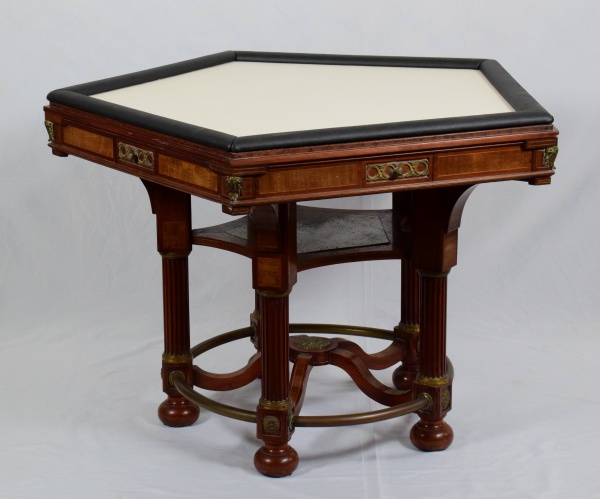 • Mesa pentagonal francesa de poker em madeira trabalhada com aplicações em bronze. Com 05 gavetinhas e 5 cinzeiros embutidos nas quinas. Forração do tampo em veludo bege. Medidas: 109 cm x 105 cm.Altura: 80 cm..