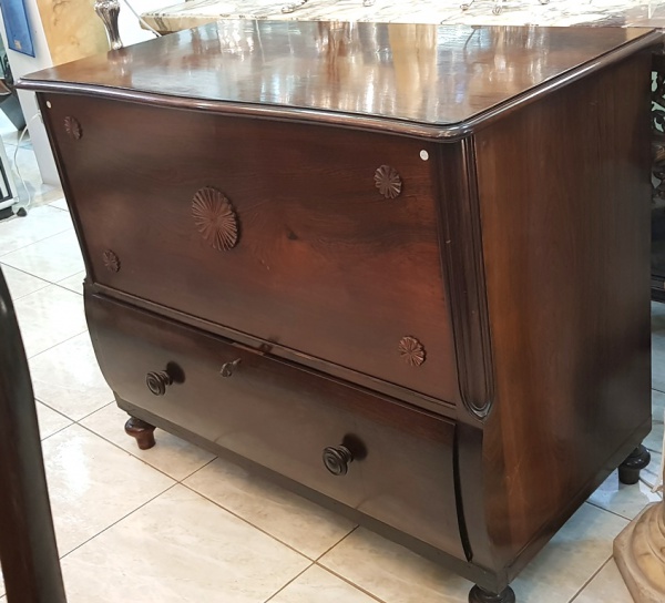 • Cômoda arca estilo inglês em jacarandá. Possui 1 gavetão e tampa interna com fechadura Medidas: 104 cm x 53 cm; Altura: 85 cm.