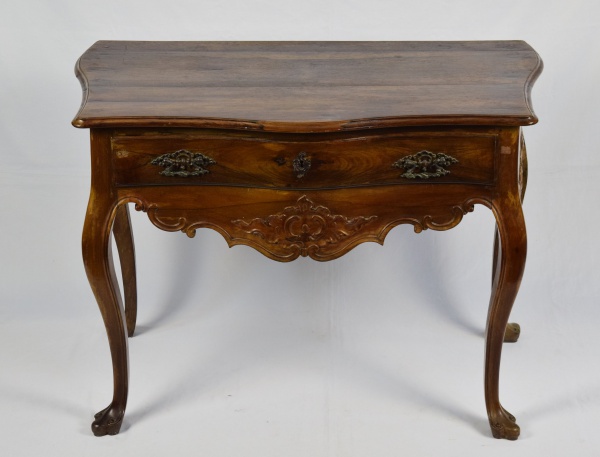 • Mesa de encostar em jacarandá maciço com 1 gaveta. Brasil, século XIX. Medidas: 115 cm x 64 cm. Altura: 80 cm.