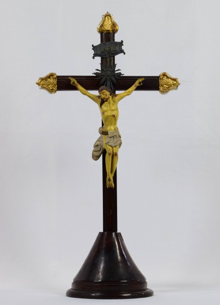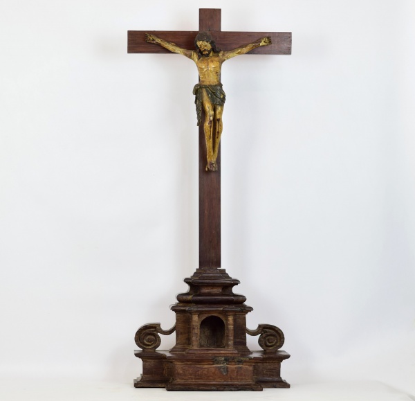 • Crucifixo em madeira com base apropriada para imagens de calvário (faltantes). Brasil, século XVIII. Altura: 88 cm.