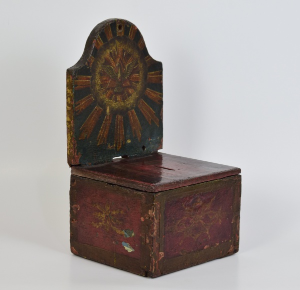 • RARO cofre de esmolas em madeira com policromia alusiva ao Divino Espírito Santo. Minas Gerais, séc. XVIII-XIX. Medidas 21 cm x 18 cm; Altura: 37 cm.