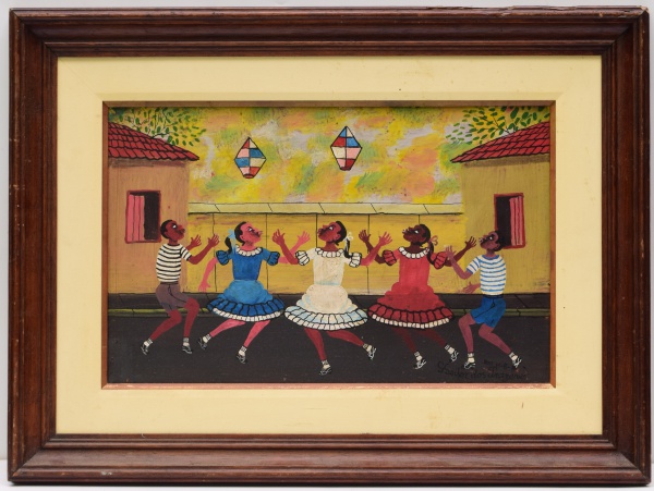 • HEITOR DOS PRAZERES (Rio de Janeiro, 1898 - 1966) - "Crianças com Balões" - Pintura óleo sobre placa. Datado e assinado no c.i.d. Rio 11-8-64. Medida da placa: 35 cm x 55 cm. Medida da moldura: 57 cm x 77 cm. Acompanha certificado de autenticidade emitido pelo filho, curador da obra do artista.