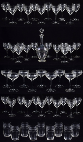 • Aparelho de 43 peças em cristal francês St. Louis, composto de: 1 licoreira (32 cm), 12 taças para vinho (16 cm), 9 taças para champanhe (14 cm), 11 taças (13 cm), 9 copinhos (9 cm) e 3 taças de licor (9 cm). Total: 43 peças.