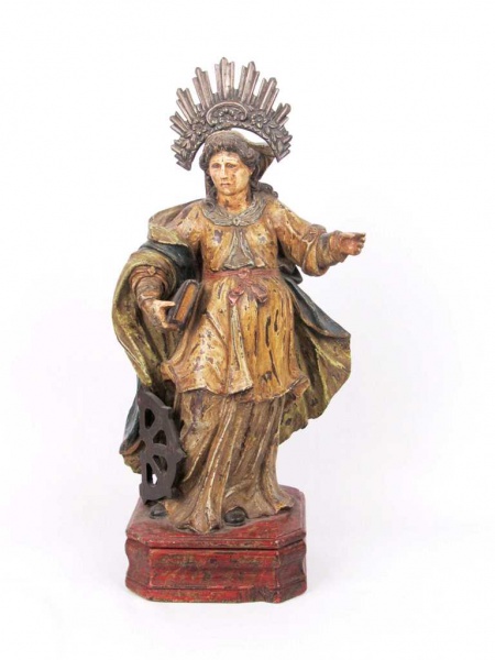 • Imagem de Santa Catarina de Alexandria em madeira policromada. Brasil, século XVIII-XIX. Altura: 41 cm.