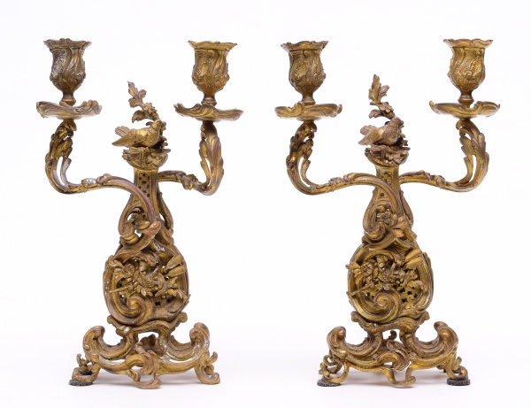 • Par de candelabros de bronze para 2 velas. Altura: 33 cm.