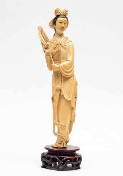• Estatueta de marfim representando gueixa apoiada sobre base de madeira. Altura total: 35 cm.