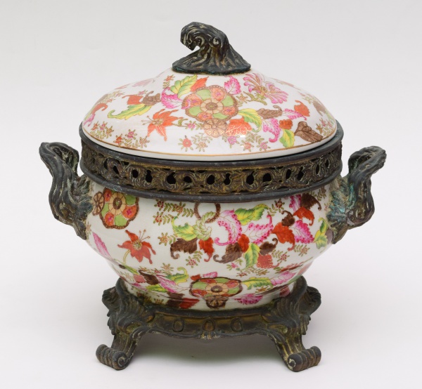 • Terrina / sopeira oval e tampa em porcelana CASTILIAN, decoração ao gosto oriental com guarnições em bronze. Medidas: 30 cm x 20 cm. Altura: 28 cm