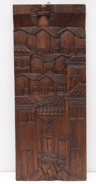 • Arte Popular - Placa de madeira sem assinatura entalhada com casario. Medidas: 70 cm x 29 cm.