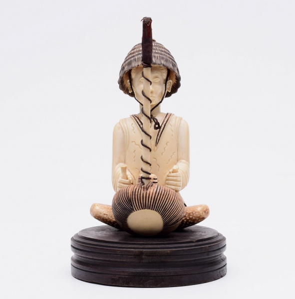 • Escultura em marfim representando figura de tecelão apoiado em base de madeira. Altura total: 24 cm.