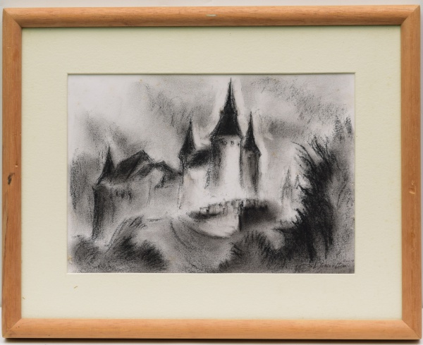 • FRANK SCHAEFFER (Belo Horizonte-MG, 1917 - Rio de Janeiro-RJ, 2008) - "Castelo" - desenho carvão sobre cartão - assinado no c.i.d. 2004. Acondicionado em moldura de vidro. Medidas do desenho: 19 cm x 28 cm. Medidas da moldura: 33 cm x 41 cm.