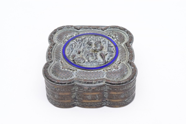 • Caixa em metal, forrada na cor  vinho, figuras de casal em relevo contornados por um círculo em esmalte azul. Medidas 10 cm x 10 cm. Altura: 3,5 cm