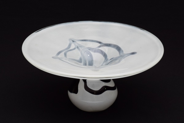 • Centro de mesa em vidro de murano branco com traços em preto. Assinado Glass Studio. Diâmetro: 31 cm, altura: 15 cm, base: 12 cm,