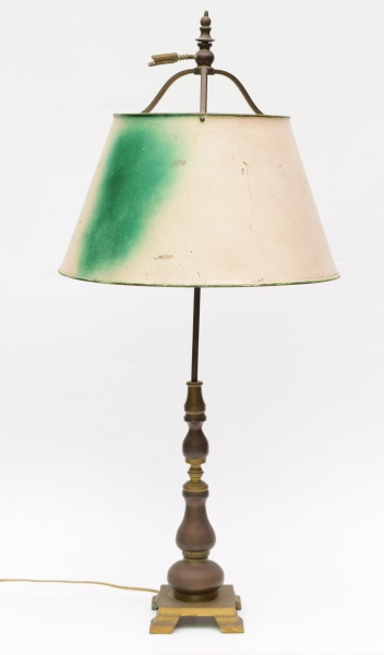 • Abajur para 2 lâmpadas. Estrutura em bronze e cúpula em metal (manchada). Altura: 87 cm.