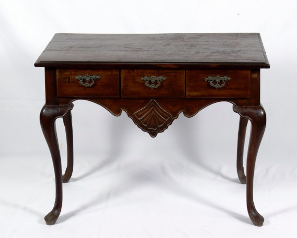 • Mesa de encostar em madeira nobre, tampo maciço, com 3 gavetas. Puxadores em bronze. Medidas: 100 cm x 57 cm. Altura: 75 cm.