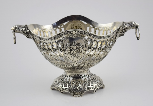 • Fruteira centro de mesa em prata alemã do século XIX. Apresenta figura de pássaros nas laterais segurando anéis com o bico. Contraste teor 800 mls. Medidas: 37 x 19 cm; Altura: 21 cm. Peso: 1.022 gramas