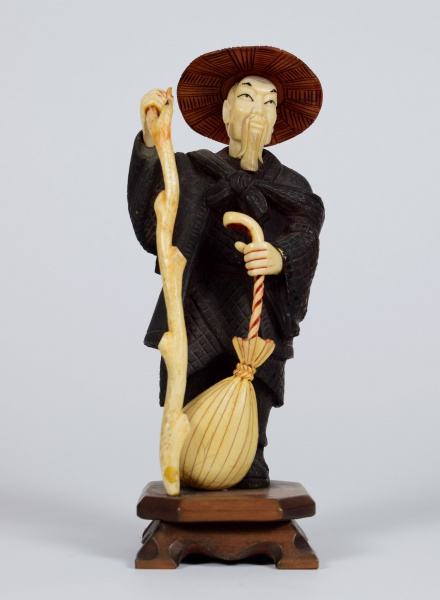 • Estatueta em bronze com marfim representando ancião. Base de madeira. Altura total: 22 cm