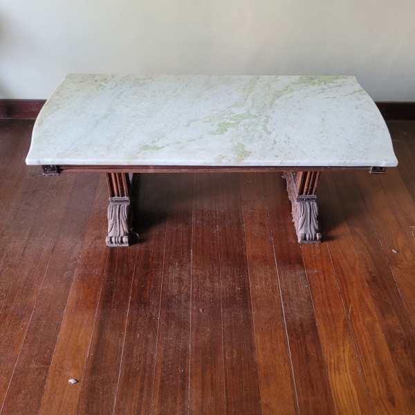 • Mesa de centro em madeira nobre com tampo em mármore branco. Medidas: 120 cm x 56 cm. Altura: 40 cm. ATENÇÃO: Retirada com agendamento na Barra da Tijuca, Condomínio Santa Mônica Residências.