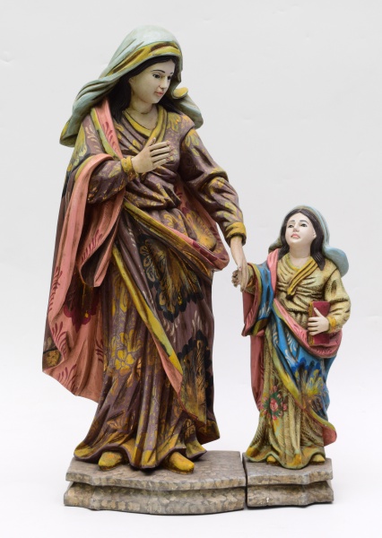 • Imagem de Santana Caminhante em madeira policromada. Brasil, século XX. Medida da base: 40 cm x 20 cm. Altura total: 71 cm.