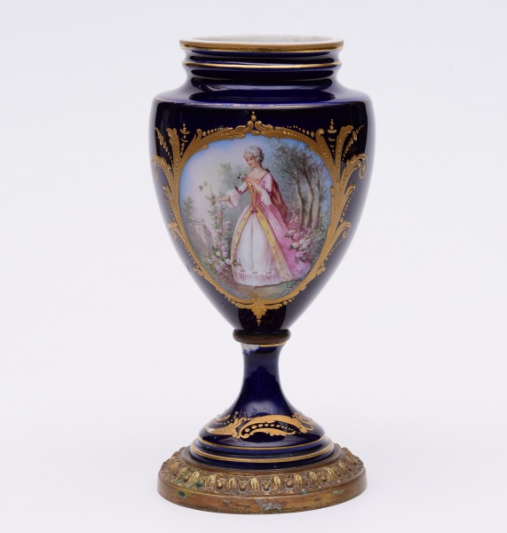 • Ânfora em porcelana possivelmente austríaca, Velho Viena, na cor predominante azul cobalto e detalhe de figura de dama. Base em bronze. Pequeno lascado na base (vide foto). Altura: 20 cm