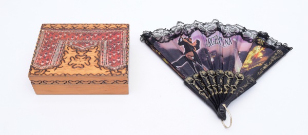 • 2 itens, sendo: A) uma linda caixa em madeira para guardar baralho medindo: 17 cm x 12,8 cm e 6 cm de altura; B) um leque em cujo tema é tango. Apresenta uma perfuração na  tela.