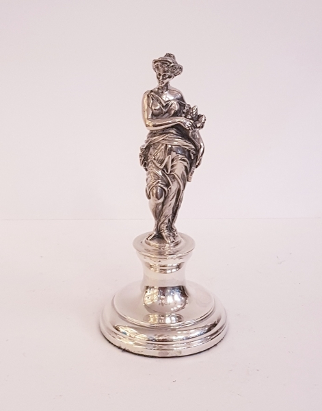 • Estatueta de prata europeia, sem marcas de contraste, representando camponesa. Altura: 17 cm. Peso bruto: 365 gramas.