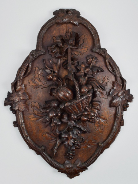 • Antigo florão em madeira entalhada com motivos de frutas e flores. Peça provavelmente austríaca do século XVIII-XIX. Largura: 57 cm. Altura: 75 cm.
