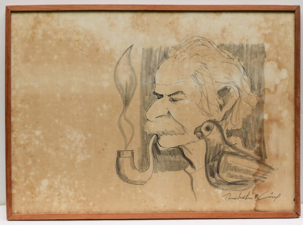 • Desenho a nanquim sobre cartão - "Retrato de Frank Schaeffer" - assinatura não identificada no c.i.d.. Acondicionado em moldura com vidro. Medida do desenho: 47 cm x 65 cm. Medidas da moldura: 59 cm x 67 cm.