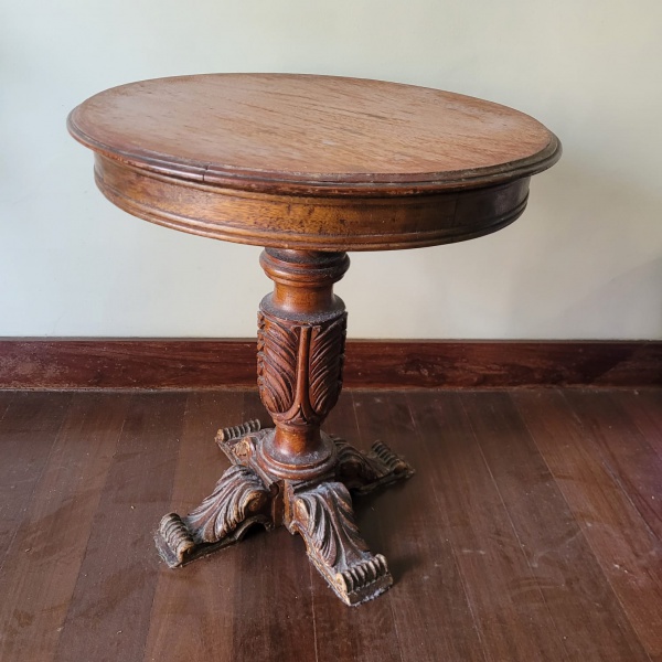• Mesinha redonda em madeira nobre. Diâmetro: 54 cm. Altura: 57 cm. ATENÇÃO: Retirada com agendamento na Barra da Tijuca, Condomínio Santa Mônica Residências.