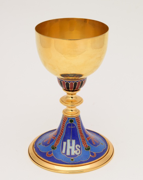 • Cálice litúrgico italiano em metal dourado com esmalte. Altura: 20 cm.