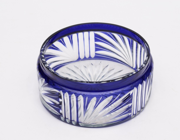 • Caixa redonda, porta algodão, em cristal Tcheco na cor azul. Falta a tampa. Diâmetro: 16 cm. Altura: 7 cm.
