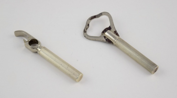 • 2 abridores de garrafas com sacarrolha de metal, acondicionados em cabos cilíndricos de prata de lei contrastada 835 mls. Medindo 10 cm cada. Peso líquido da prata: 33 gramas