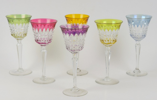 • Conjunto de 6 taças de cristal europeu diversas cores. Medida: 19,5 cm.