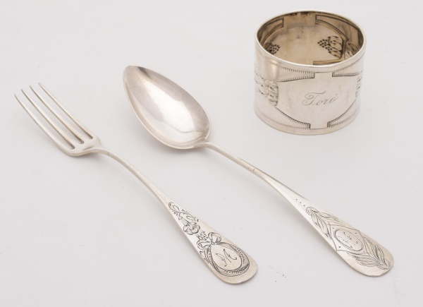 • 3 peças em prata de lei, contraste teor 800 mls, sendo garfo e colher (15 cm) e porta guardanapo (diâmetro 4,5 cm x altura 3,5 cm). Peso: 40 gramas.
