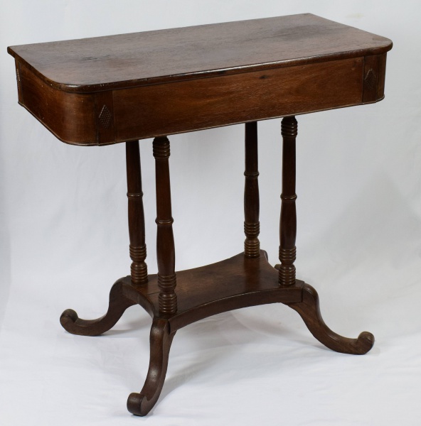• Console em jacarandá. Tampo maciço apoiado sobre 4 colunas com leve torneado. Medidas: 99 cm x 47 cm. Altura: 83 cm.