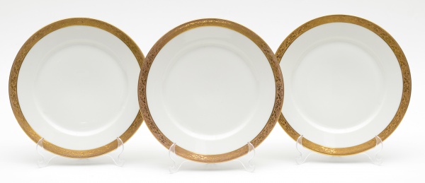 • Três pratos em porcelana francesa, Limoges, borda em ouro. Diâmetro: 21 cm.