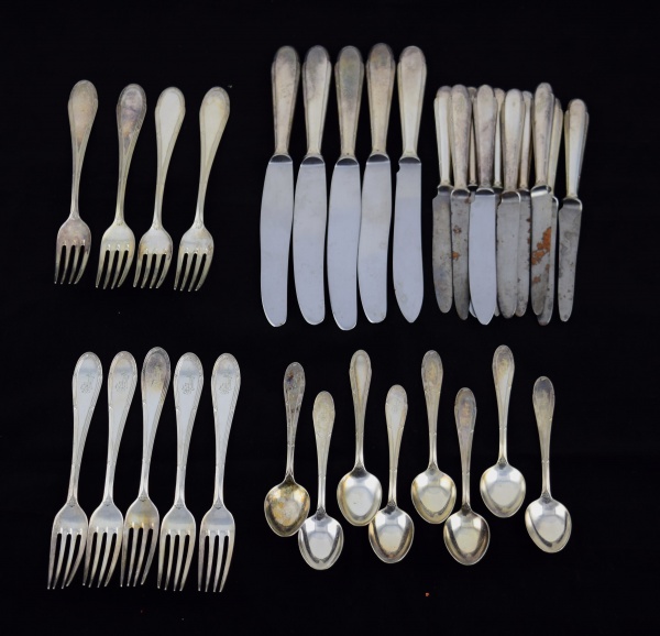• Parte de faqueiro (32 peças) em metal prateado alemão marcado WMF constando de: 5 facas, 10 facas de sobremesa, 4 garfos, 5 garfos de sobremesa e 8 colheres de chá.