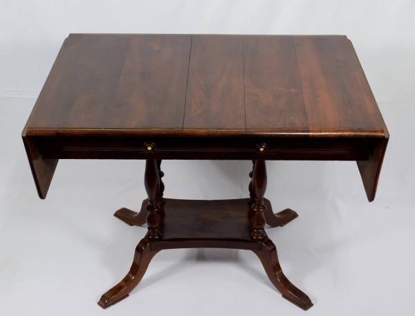 • Antiga mesa de abas em jacarandá, tampo maciço. Possui uma gaveta com detalhe em marfim nos puxadores. Comprimento: 158 cm (aberta) ou 108 cm (fechada). Profundidade: 80 cm. Altura: 80 cm.