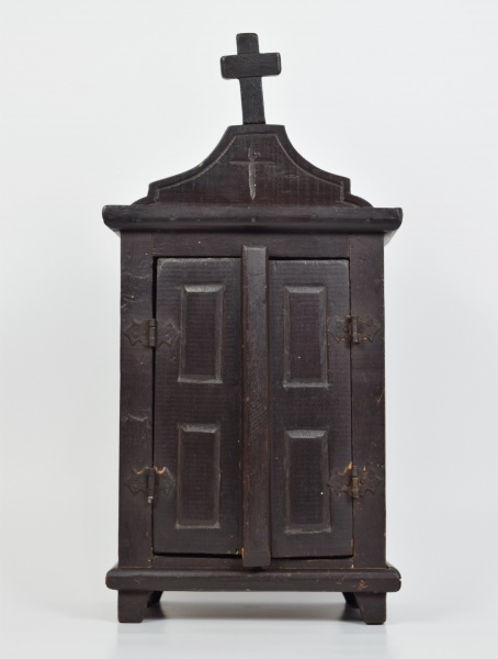 • Oratório em madeira nobre. Possui 2 portas de madeira e cruz no topo. Medidas: 21 cm x 13 cm. Altura: 45 cm