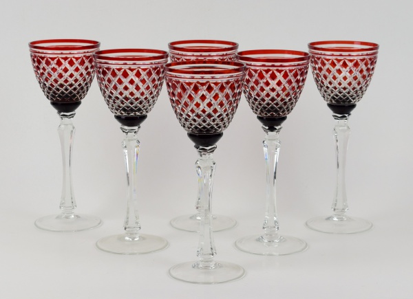 • Conjunto de 6 taças em cristal da Bohemia na cor bordeaux medindo 22cm de altura.
