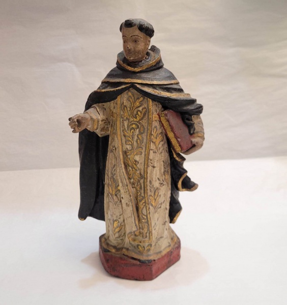 • Imagem de São Domingos em madeira policromada. Braço direito colado e falta dedo indicador da mão direita. Brasil, século XIX. Altura: 23 cm.