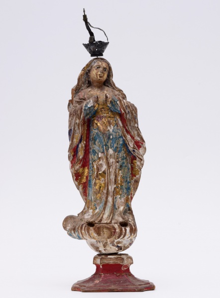 • Imagem de Nossa Senhora da Conceição em madeira policromada. Faltam as mãos. Brasil século XIX. Altura: 34 cm.