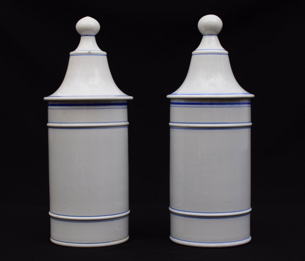 • Par de potes de farmácia em faiança na cor branca com frisos azuis. Diâmetro: 13 cm. Altura: 35 cm.