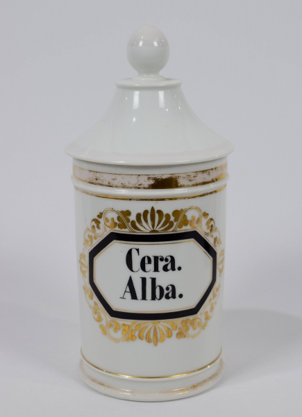 • Pote de farmácia em porcelana francesa Vieux Paris, inscrição "Cera.Alba.". Altura: 17 cm.