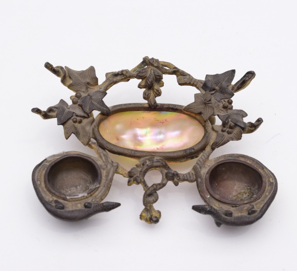 • Tinteiro em bronze com parte central em madrepérola. Medidas: 15 cm x 13 cm. Altura: 5 cm.