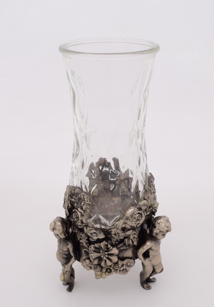 • Antiga floreira com base em metal prateado, apresentando figura de 3 meninos, e interior em vidro. Diâmetro da base: 10 cm. Altura total: 27 cm.
