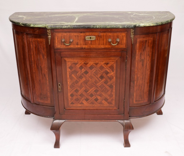 • LEANDRO MARTINS - Dunquerque em mogno marchetado com gaveta e porta. Detalhes em bronze e tampo em mármore verde. Fabricação Leandro Martins. Medidas: 130 cm x 51 cm; Altura: 106 cm.