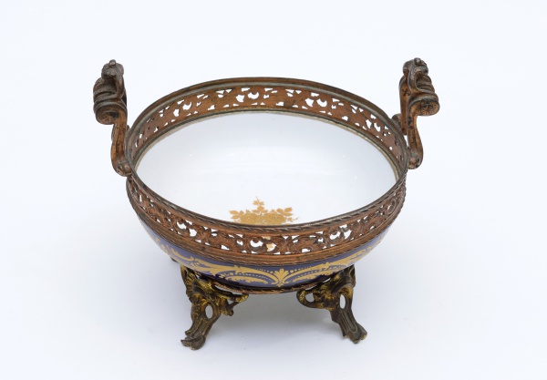 • Bowl em porcelana francesa de Sevres do século XIX, com alças e pés em bronze dourado. Interior   branco e parte externa em azul e ouro. Diâmetro: 17 cm. Altura: 12 cm (bowl) ->17 cm (alças)