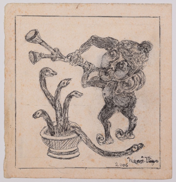 • NANÁ VIEGO (Cuba 1928 - Rio 2011) - "Encantador de Serpente" - desenho sobre cartão - assinado no c.i.d. 2006 - medida: 25,5 cm x 24 cm. Sem moldura.